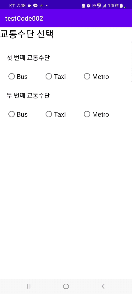 작성한 라디오버튼 테스트 앱을 실행해보면 다음과 같이 구동되는 것을 확인할 수 있다.