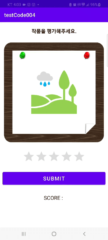 레이팅바를 드래그 또는 터치하여 별점을 선택한 후 버튼을 눌렀을 때 반응하여 스코어 텍스트에 표시되는 것이 전부이므로 버튼, 텍스트뷰, 레이팅바에 대한 id값만 연결해주면 된다.