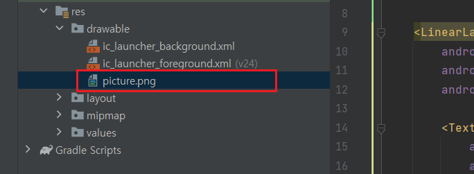 이미지로 사용할 png 파일을 res - drawable 디렉터리로 이동하였다.