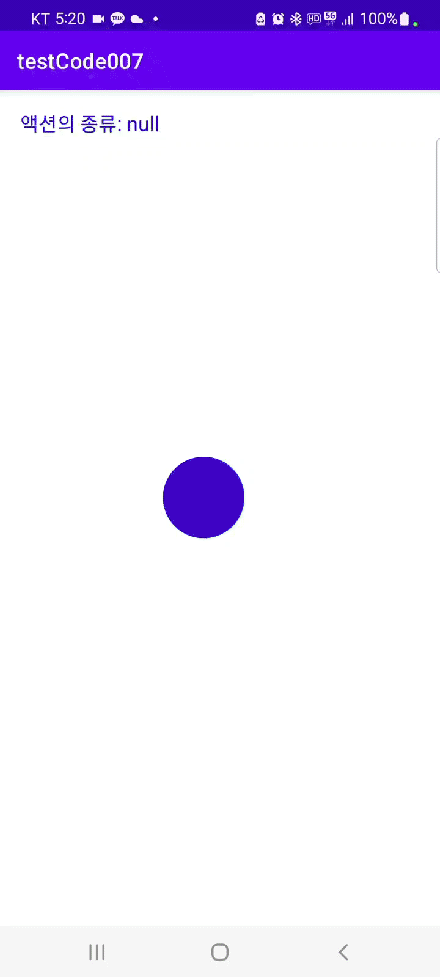 구현하고자 했던대로 화면의 원을 터치하여 원하는 위치로 이동할 수 있으며, 동작에 따른 이벤트를 상단의 텍스트에 보여준다.