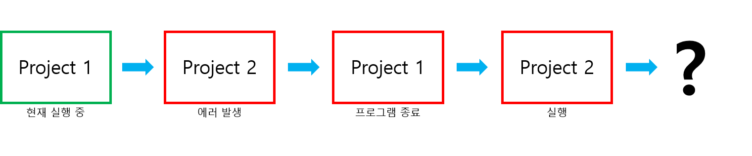 위와 같이 프로젝트2가 실행이 안되는데, 프로젝트2에 해당하는 안드로이드 스튜디오를 종료하지 않고 기존에 실행중인 프로젝트1에 해당하는 안드로이드 스튜디오를 종료하고 프로젝트2를 실행하면 어떻게 될까?
