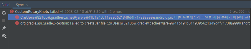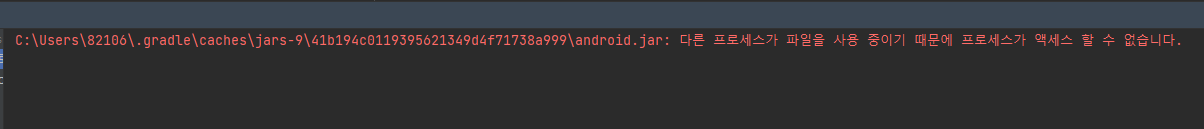 "android.jar : 다른 프로세스가 파일을 사용 중이기 때문에 프로세스가 액세스 할 수 없다"라고 에러가 발생한다면 그냥 아무것도 생각말고 안드로이드 스튜디오를 모두 종료한 후에 다시 실행해보면 해결이 된다.