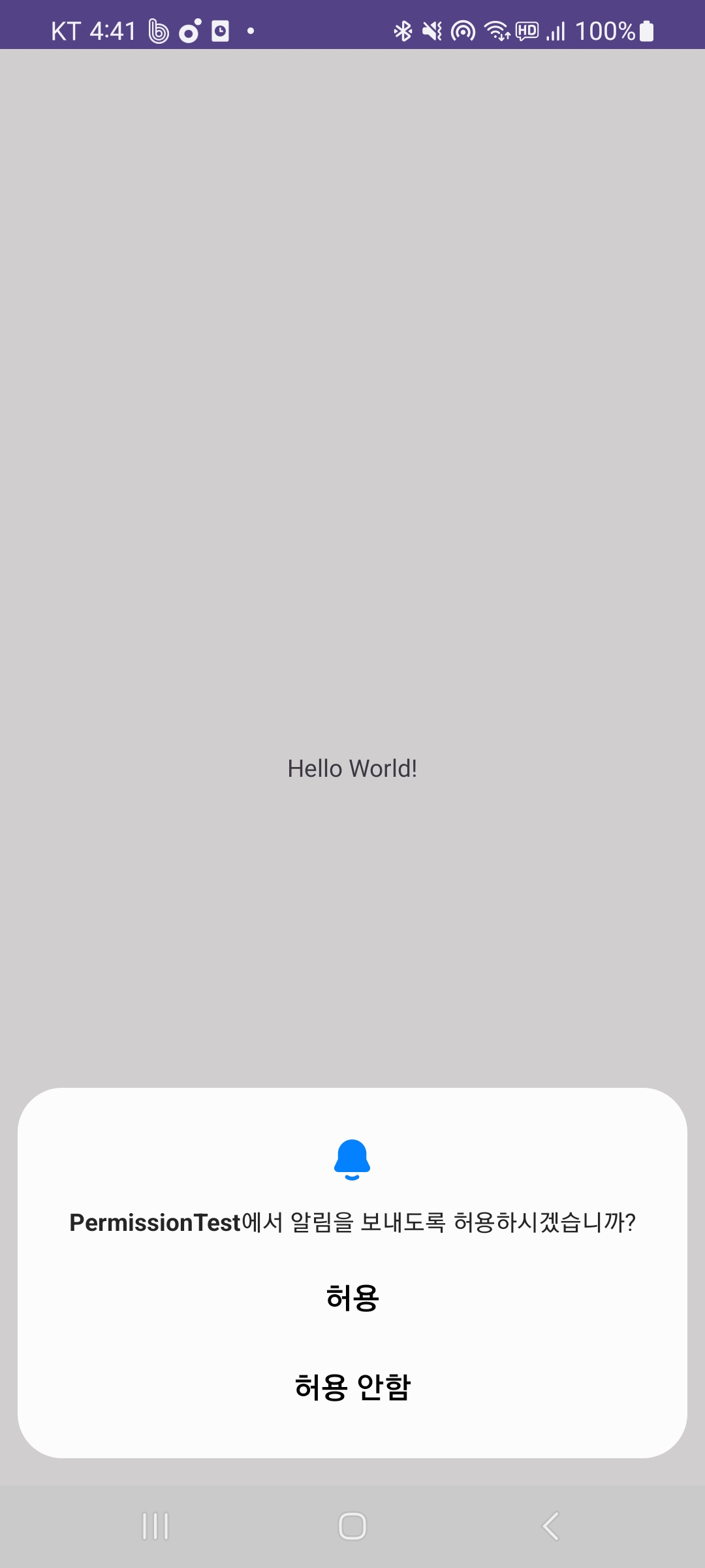 화면 하단에 알람에 대한 권한 허용을 묻는 다이얼로그가 나타나 구현한 기능이 정상 작동하는 것을 확인할 수 있다. 이렇게 사전에 앱의 권한을 설정함으로써 기능이 정상적으로 작동하지 않는 문제를 해결할 수 있다. 권한 설정 기능을 담은 PermissionUtils.java를 작성하여 해당 클래스를 권한 설정을 묻는 다이얼로그를 표시할 액티비티에 연결하여 사용하면 된다.