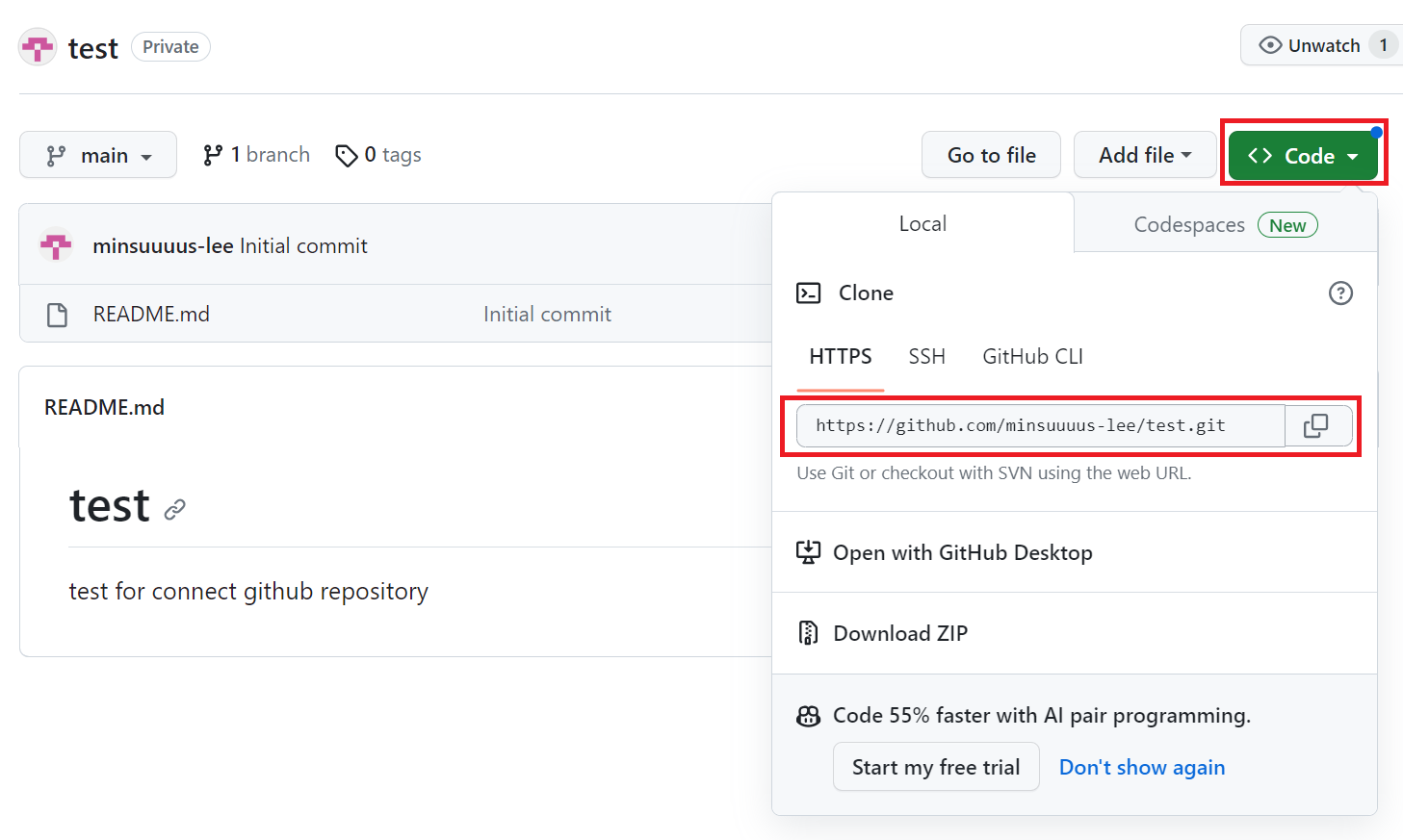 깃허브 레파지토리 주소를 확인하기 위해 다시 깃허브 페이지로 이동하자. 깃허브 페이지에서 내가 생성한 레파지토리를 선택하면 다음과 같이 레파지토리에 대한 정보가 나온다. 여기서 <> Code 버튼을 누르면 HTTPS 주소 정보를 확인할 수 있다.
