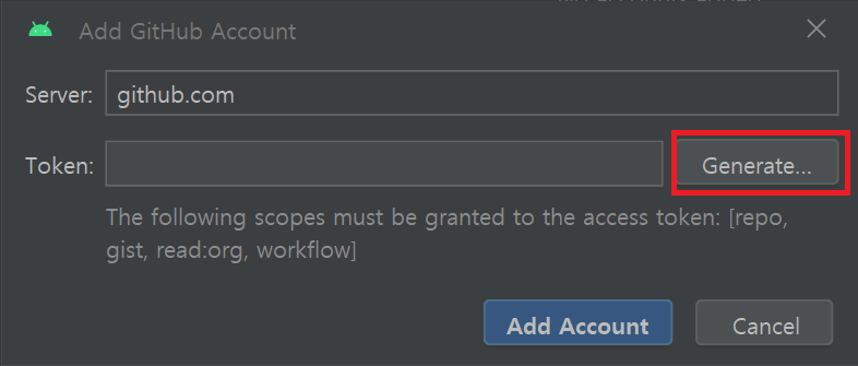 깃허브 계정을 추가하기 위해서는 깃허브 계정의 토큰(Token)이 필요한데, 이는 깃허브 페이지에서 확인 가능하다. 먼저 Generate 버튼을 누르면 자동으로 깃허브 웹사이트로 이동하게 된다.