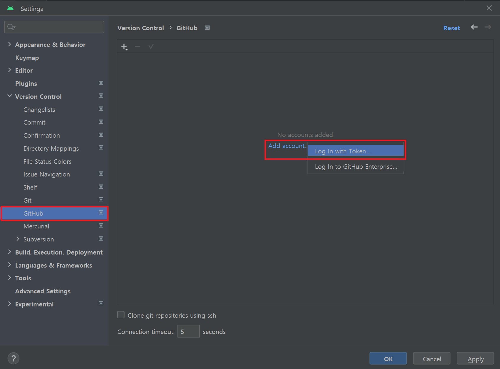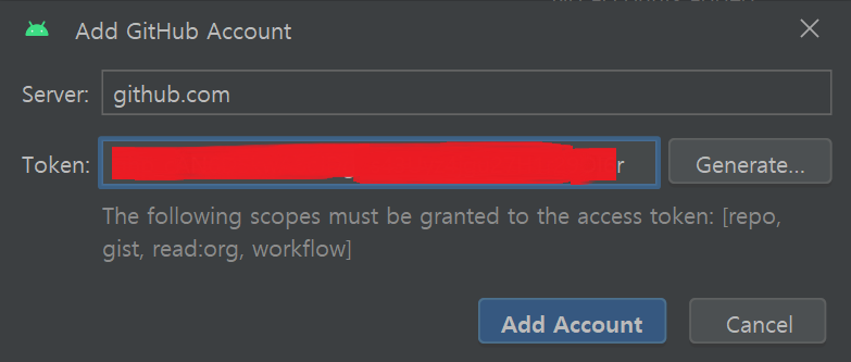 안드로이드 스튜디오의 File - Settings - Version Control - GitHub 메뉴에서 Add account 버튼을 클릭하여 깃허브 토큰을 입력하는 방법으로 깃허브 계정을 추가할 수 있다.