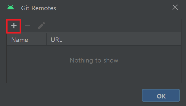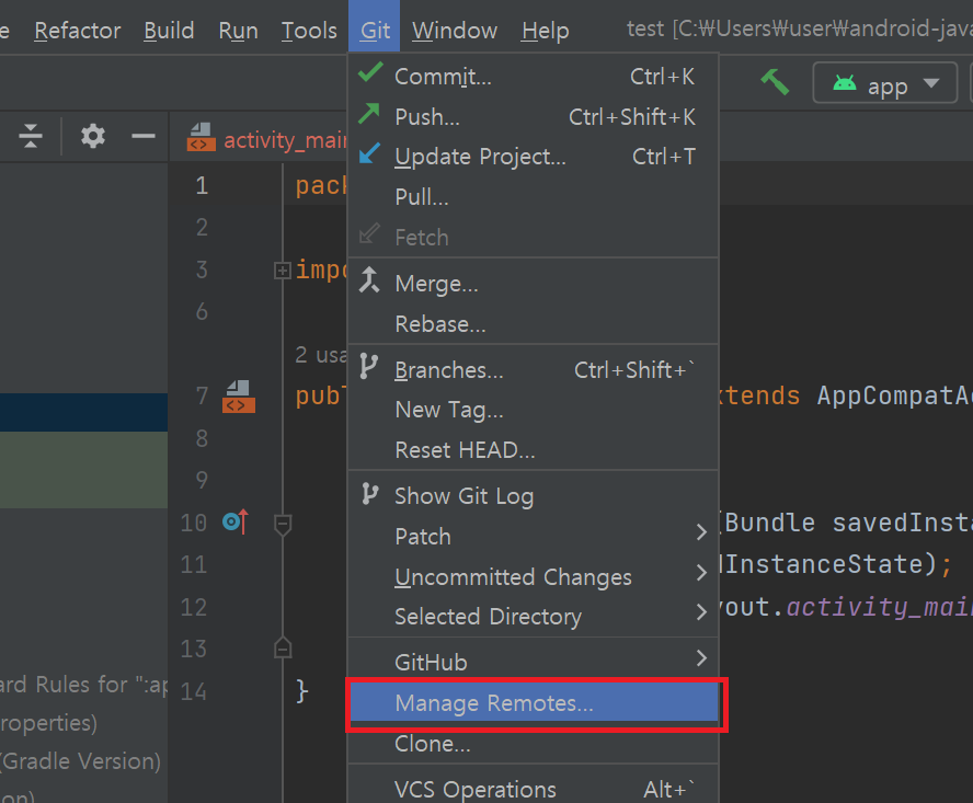 생성된 Git Repository를 깃허브 레파지토리에 연동하기 위해 연동을 하려는 깃허브 레파지토리의 주소가 필요하다. 안드로이드 스튜디오의 Git - Manage Remotes 메뉴를 선택하여 레파지토리의 주소를 추가할 수 있다.
