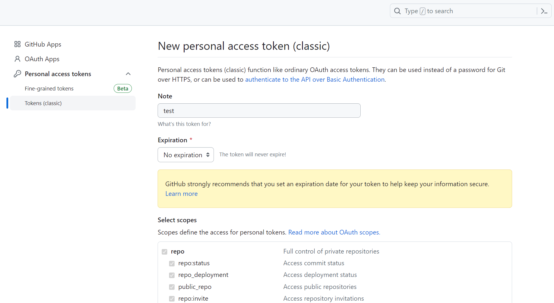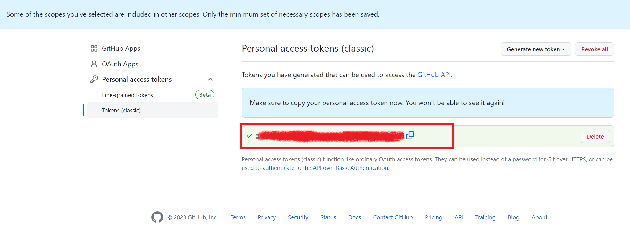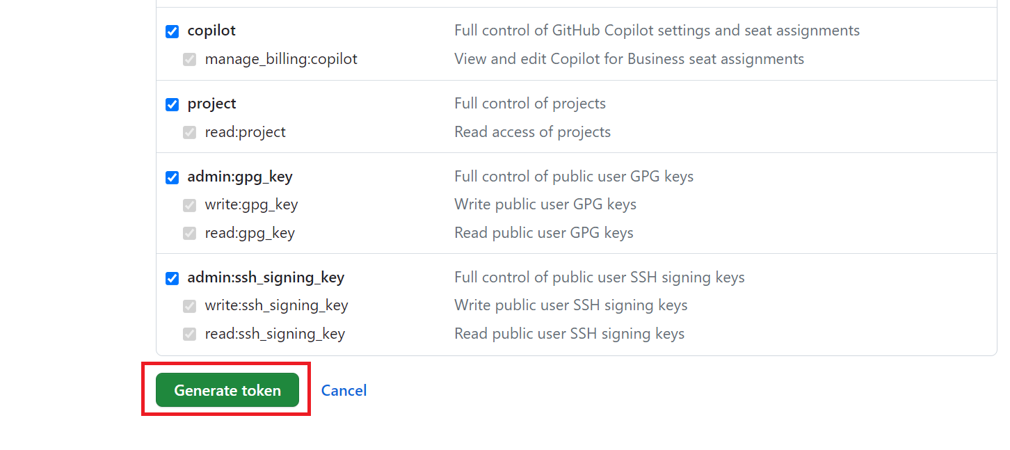 스크롤을 내려 가장 아래에 Generate token 버튼을 클릭하여 토큰을 생성한다.