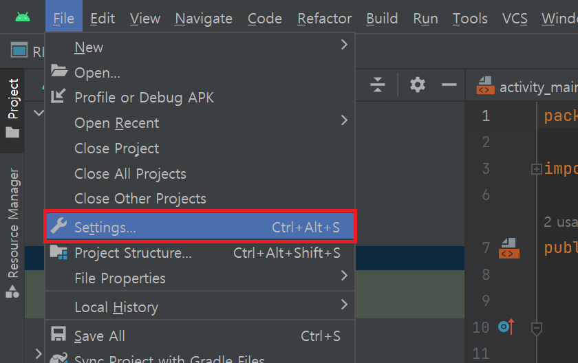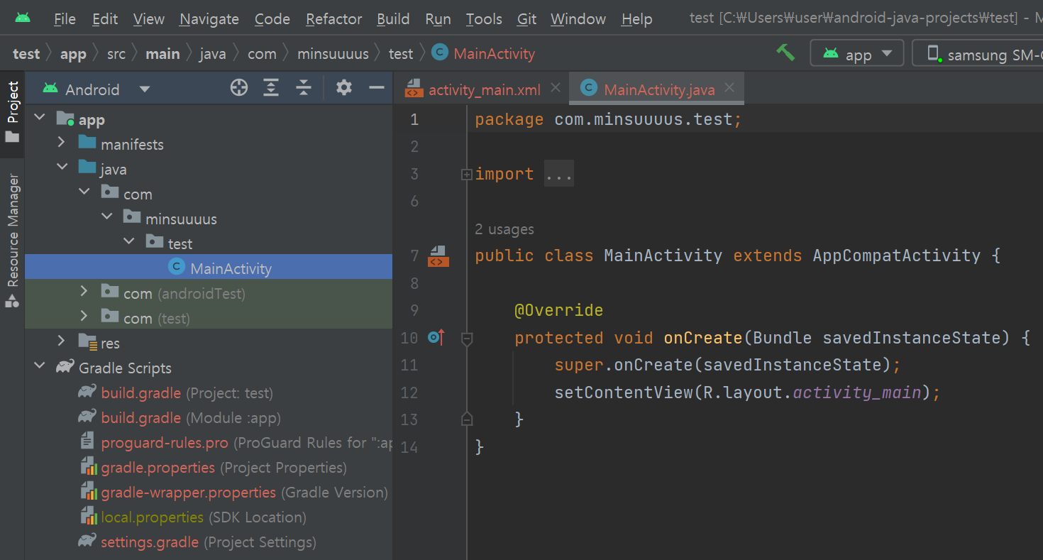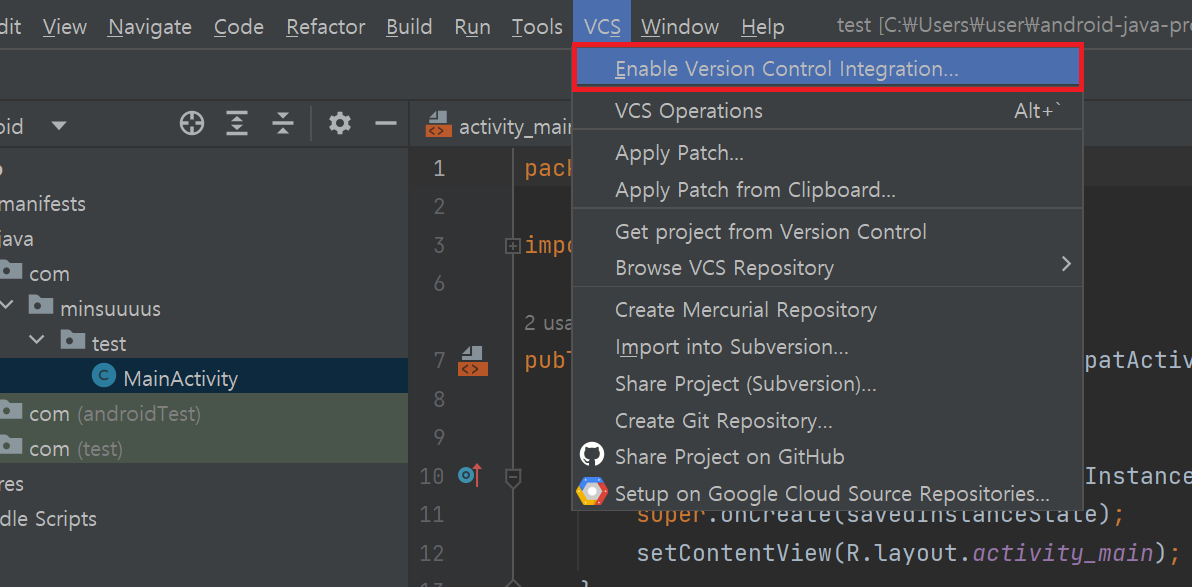 깃허브 레파지토리를 생성했다면 이 레파지토리에 연결할 안드로이드 프로젝트를 생성한다. 안드로이드 스튜디오를 실행하여 test라는 프로젝트를 생성하였다. 생성한 프로젝트를 레파지토리에 연결하기 위해 다음과 같은 과정을 거친다.