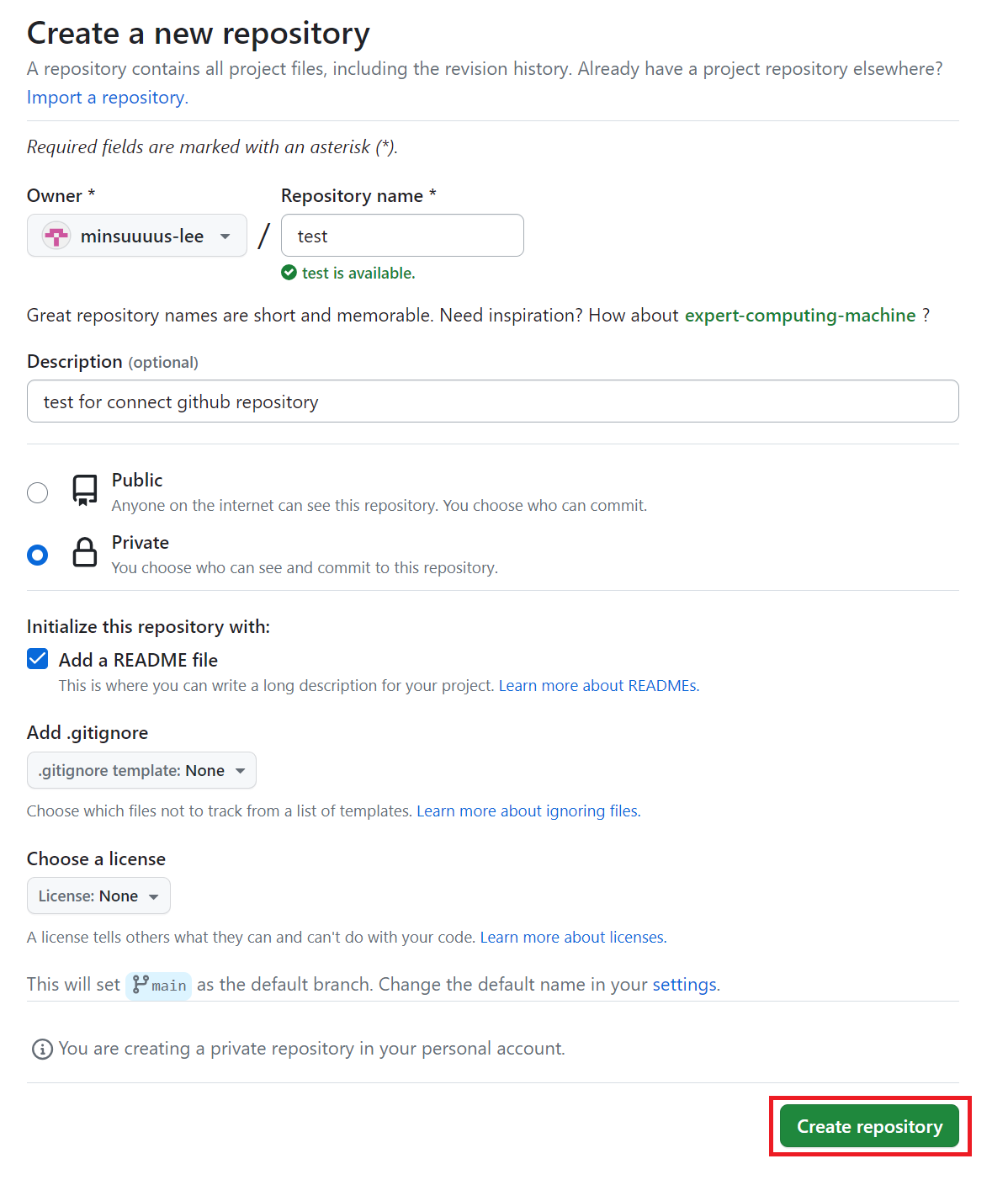 New 버튼을 누르면 위 그림과 같이 Create a new repository 화면으로 넘어가며, 여기서 레파지토리 이름, 설명, Public/Private 등 기본적인 내용을 셋팅하고 하단의 Create repository 버튼을 눌러서 레파지토리 생성을 완료한다.