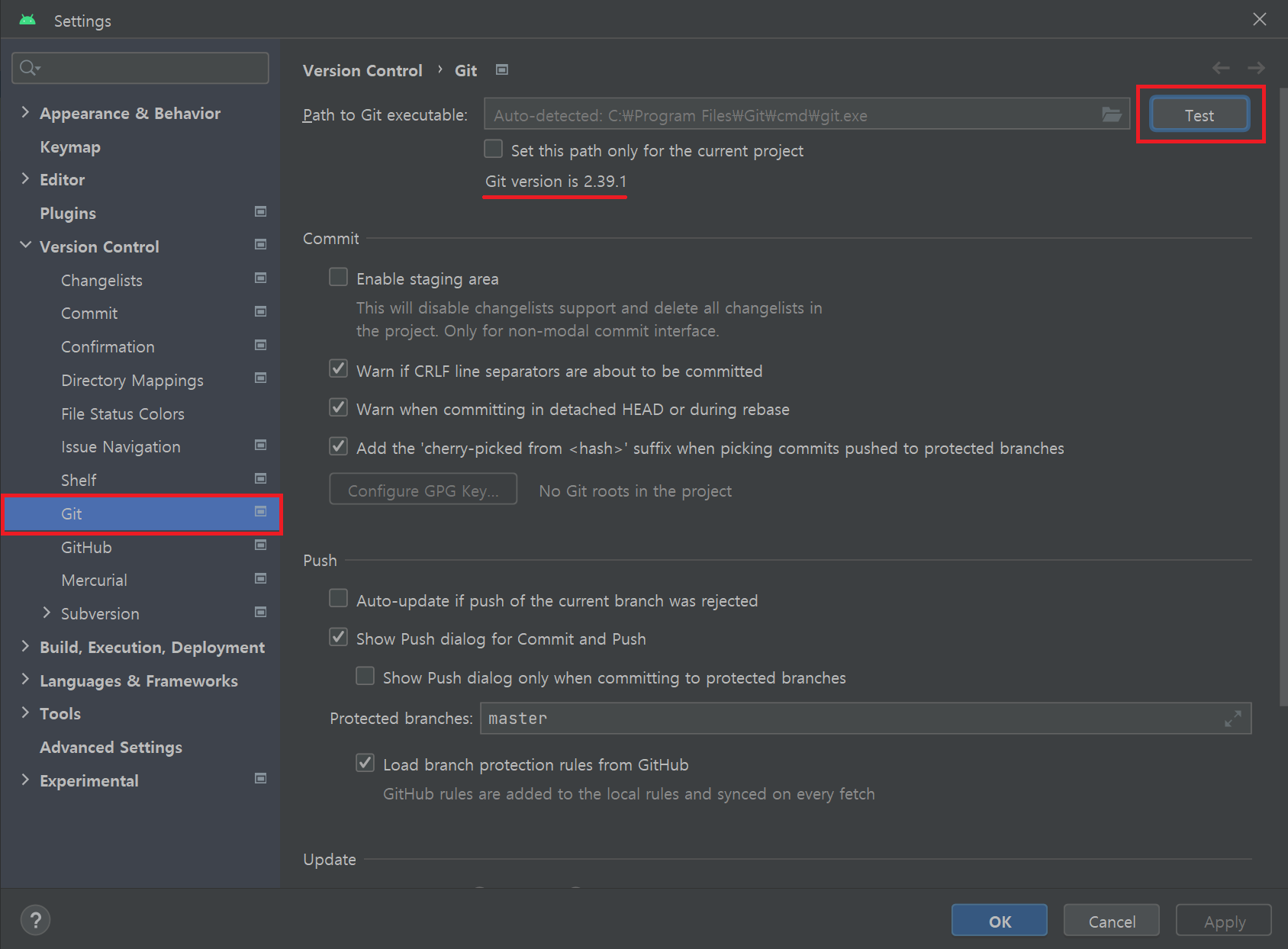 프로젝트 생성 후, File - Settings - Version Control - Git 으로 들어가서 Git의 버전 테스트를 진행한다.