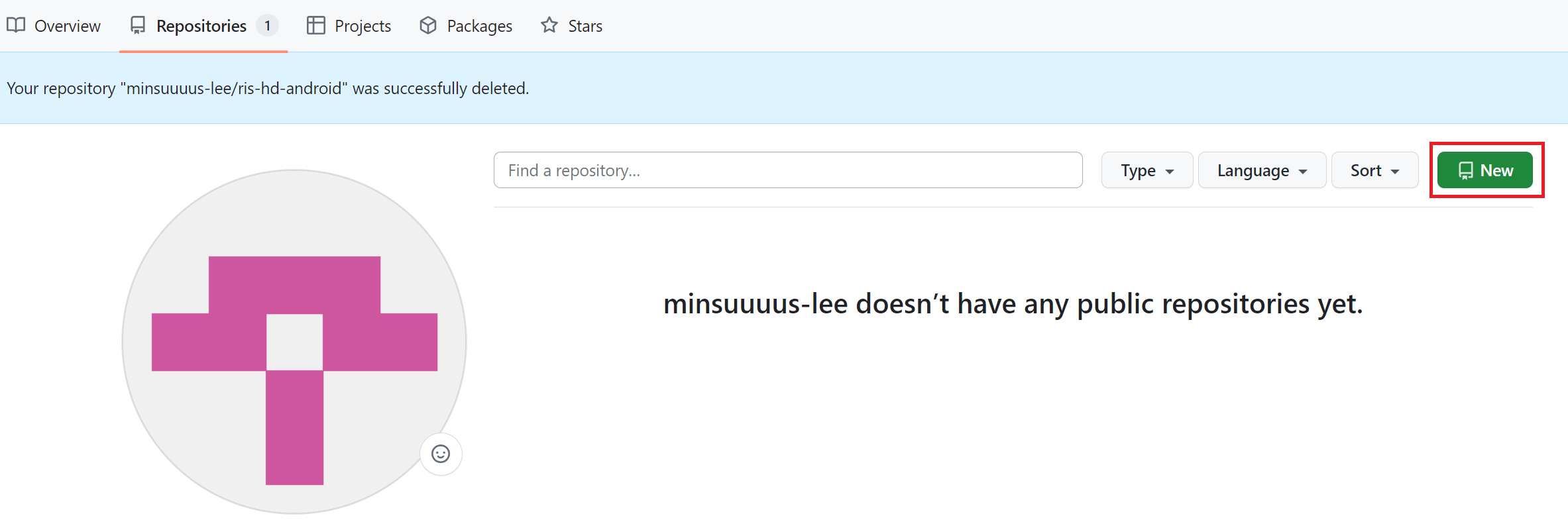 Your repositories 메뉴를 누르면 위 그림과 깉이 나 계정의 레파지토리 정보를 확인할 수 있다. 레파지토리를 만들기 전에는 위와 같이 아무 것도 없다. 여기서 오른쪽 초록색 New 버튼을 클릭하여 새 레파지토리를 생성한다.