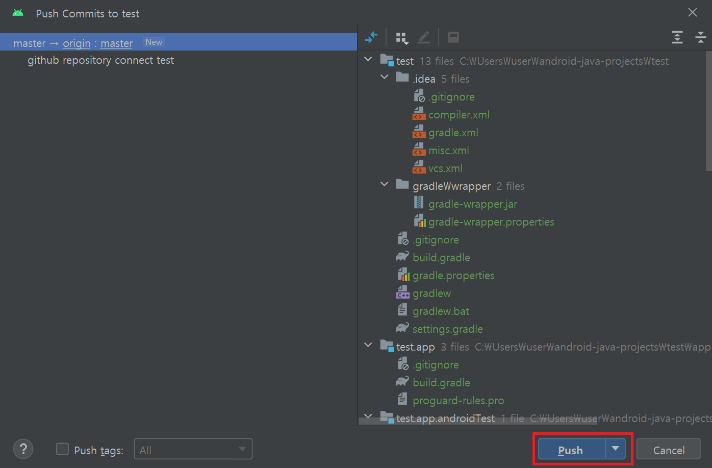 푸시 메뉴를 선택하면 다음과 같이 깃허브 레파지토리에 파일들을 연동하는 창이 나온다. 여기서 Push 버튼을 누르면 깃허브 레파지토리로 파일들이 푸시된다.