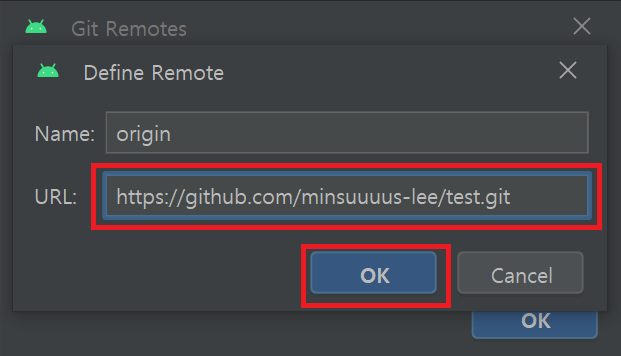 위와 같이 토큰값을 입력하면 안드로이드 스튜디오에 깃허브 계정이 추가된 것을 확인할 수 있다.