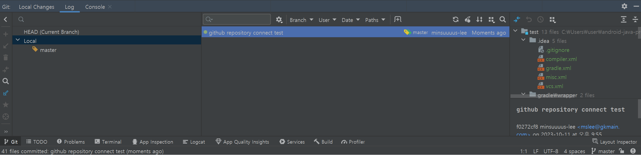 커밋이 정상적으로 완료되면 다음과 같이 안드로이드 스튜디오의 하단의 Git 창에서 커밋 내용을 확인할 수 있다. 정상적으로 커밋 되었다면 해당 파일들이 초록색으로 변경된다.