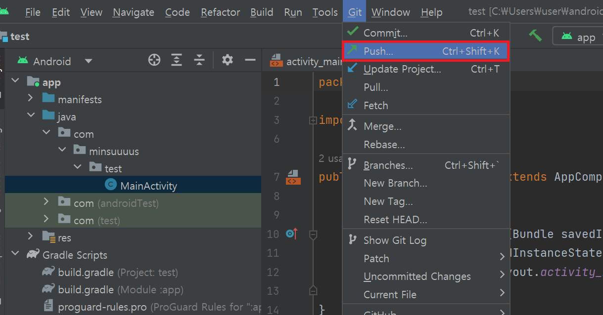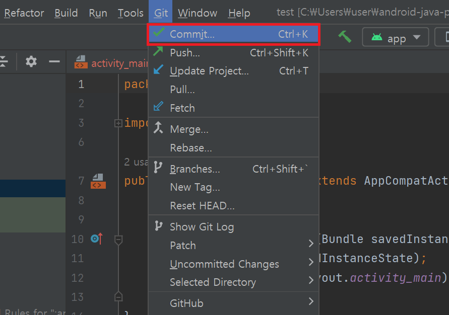 안드로이드 스튜디오와 깃허브가 제대로 연결되었는지 확인을 위해 커밋/푸시 기능을 사용해보자. 먼저 안드로이드 스튜디오의 Git - Commit 메뉴를 클릭한다.
