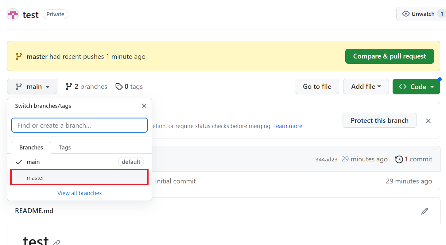 깃허브 페이지에서 내 레파지토리 중 방금 연동한 test 레파지토리를 선택하고 Branches를 master로 변경하면 위와 같이 업로드된 파일들이 목록에 나타나는 것을 확인할 수 있다.
