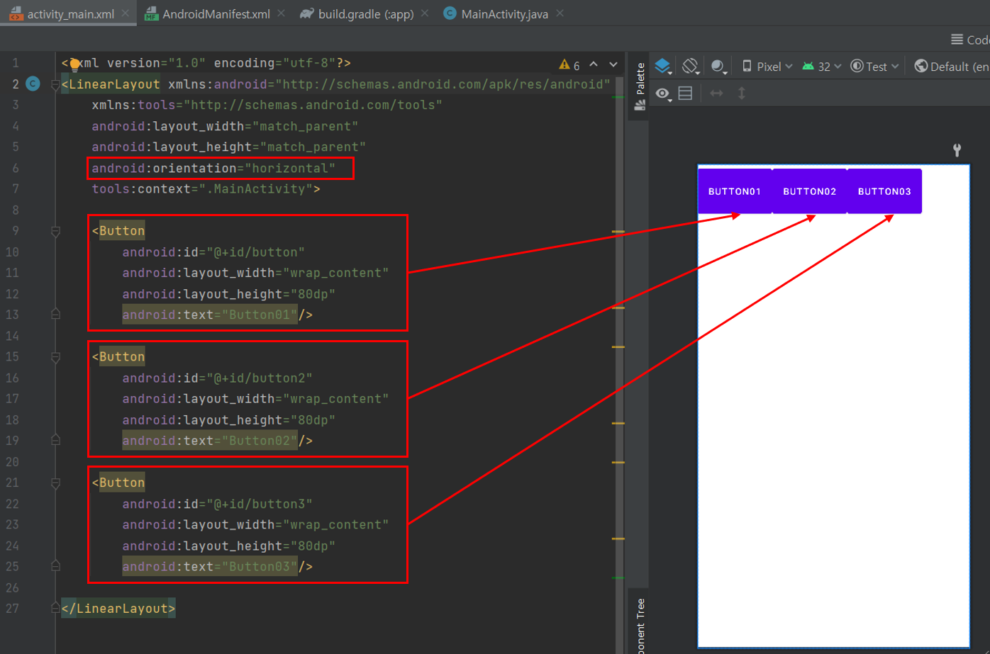 수평배치를 하려면 LinearLayout에서 orientation을 horizontal로 변경하면 된다.