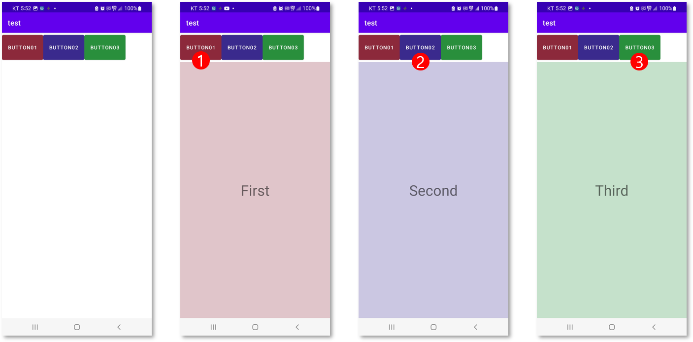 버튼2를 누르면 Second 화면, 버튼3을 누르면 Third 화면이 나타난다.