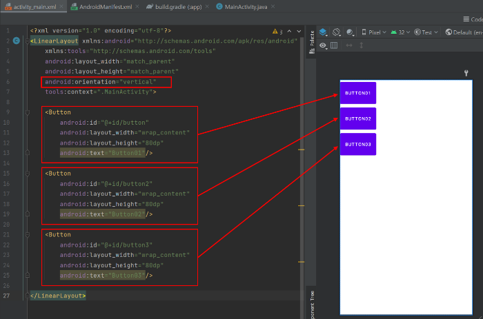 먼저 수직 배치를 하려면 LinearLayout 에서 orientation을 vertical로 지정하면 된다.