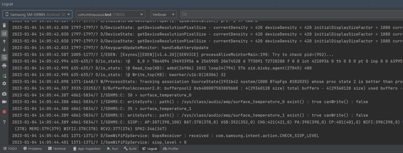 안드로이드 스튜디오 화면의 하단에 Logcat이라는 메뉴가 있다.
