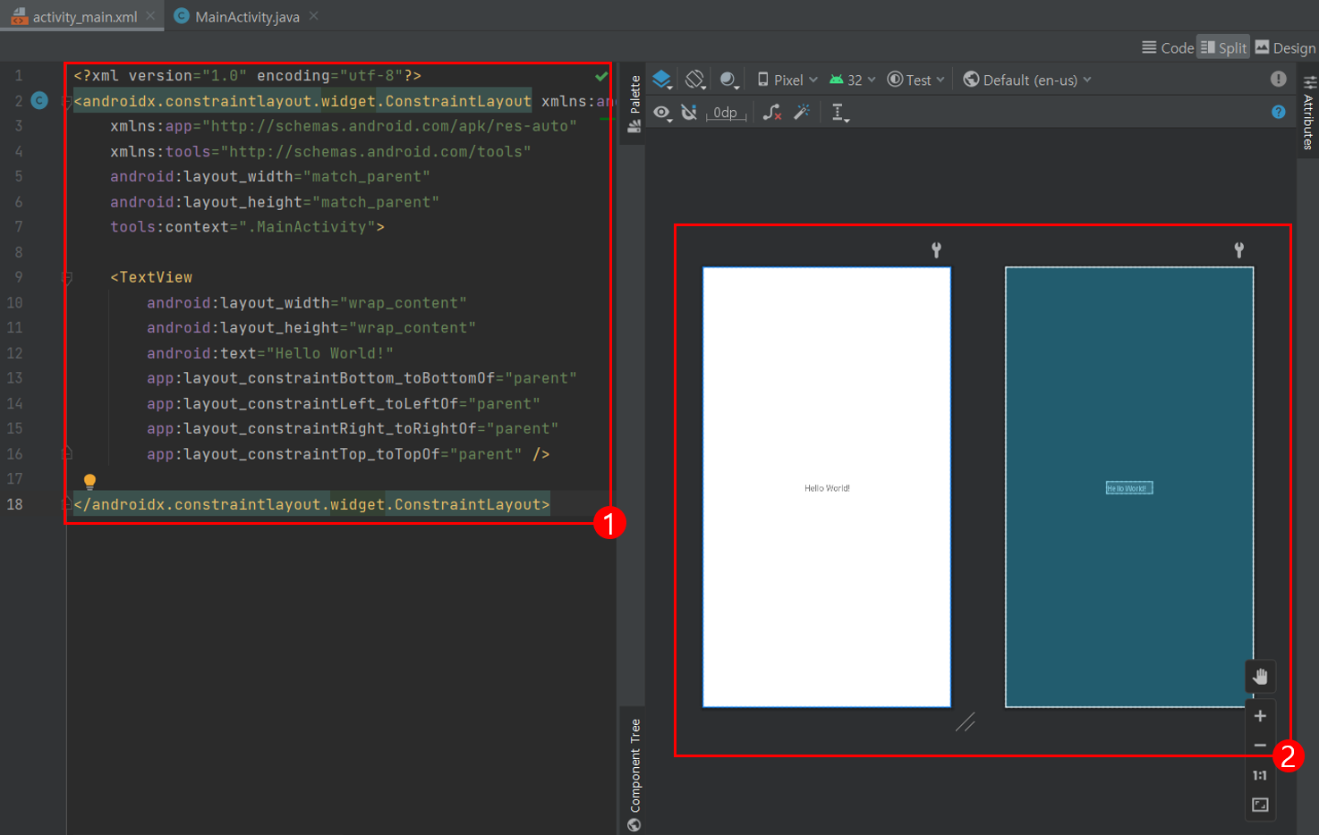 그림 오른쪽의 2번 박스는 xml 코드에 따라 보여지는 실제 화면을 확인할 수 있다.