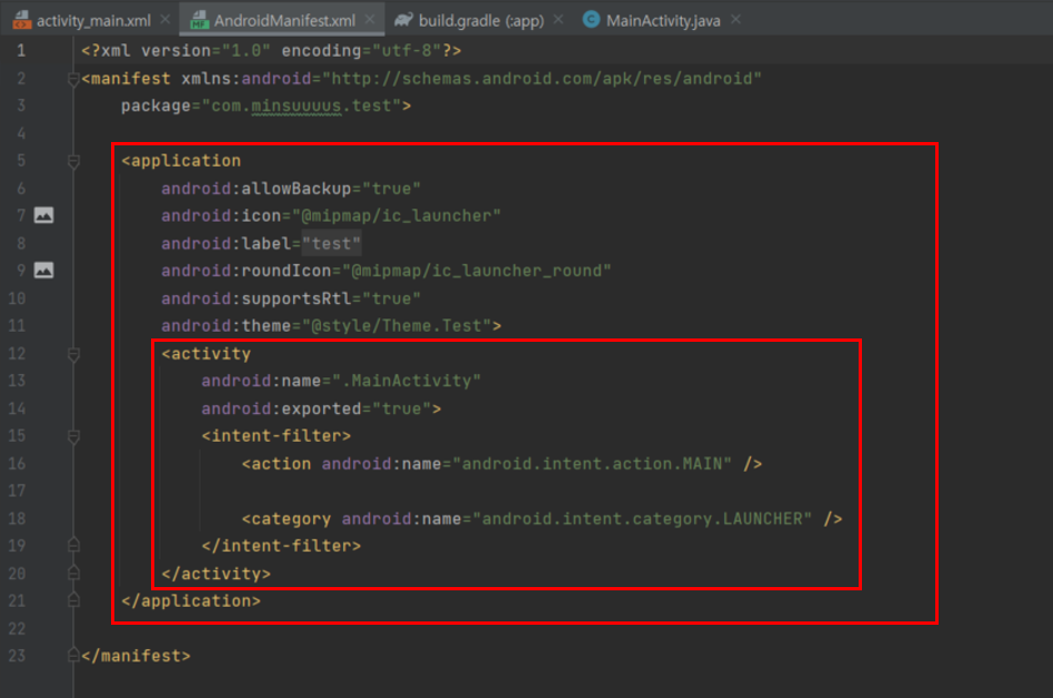 <action> 태그에 android.intent.action.MAIN이 있는데, 이 액티비티를 시작 액티비티로 실행한다는 것이다.
