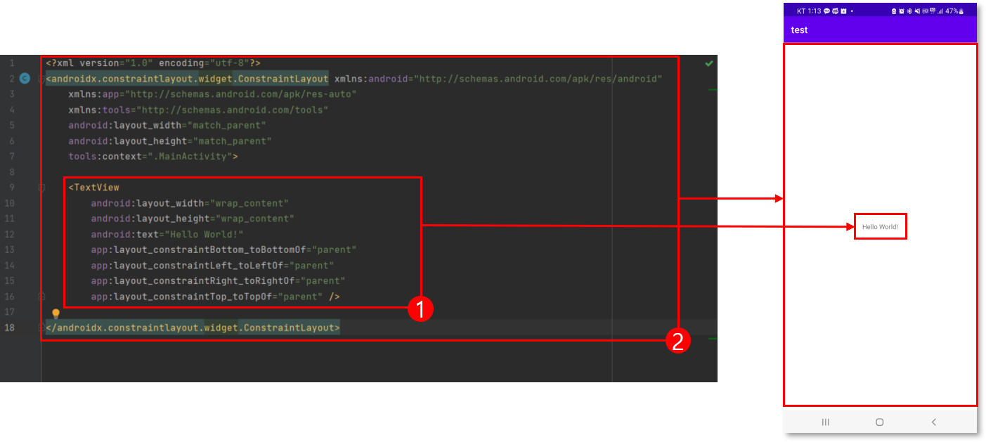 왼쪽이 XML 파일, 오른쪽이 실제 앱을 실행하여 나온 화면이다.