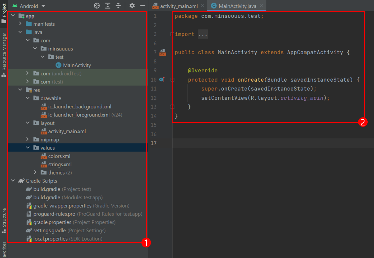 화면 왼쪽의 1번 박스의 프로젝트 뷰는 앱을 생성하는데 필요한 파일과 폴더들을 확인할 수 있다.