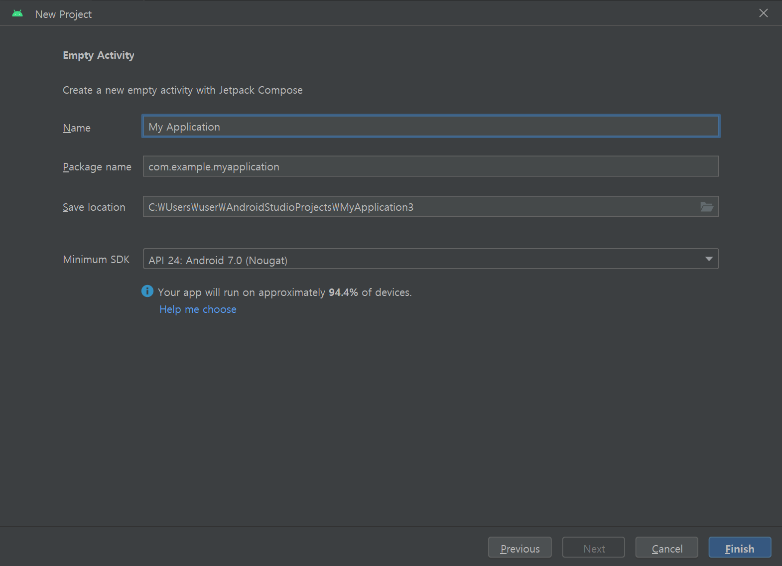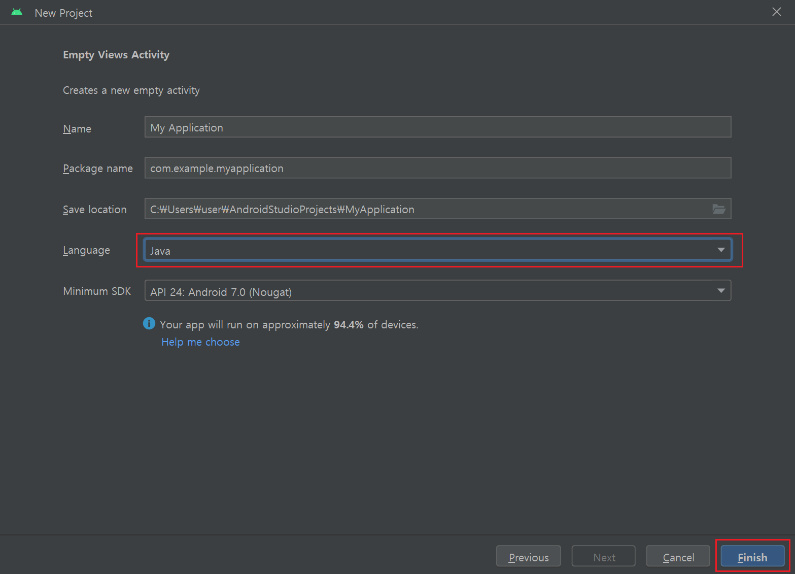 Empty Views Activity를 선택하고 프로젝트 생성을 진행하면 위와 같이 Language 선택이 가능하다. 자바 기반의 안드로이드 개발을 한다면 필수적으로 알아두자.