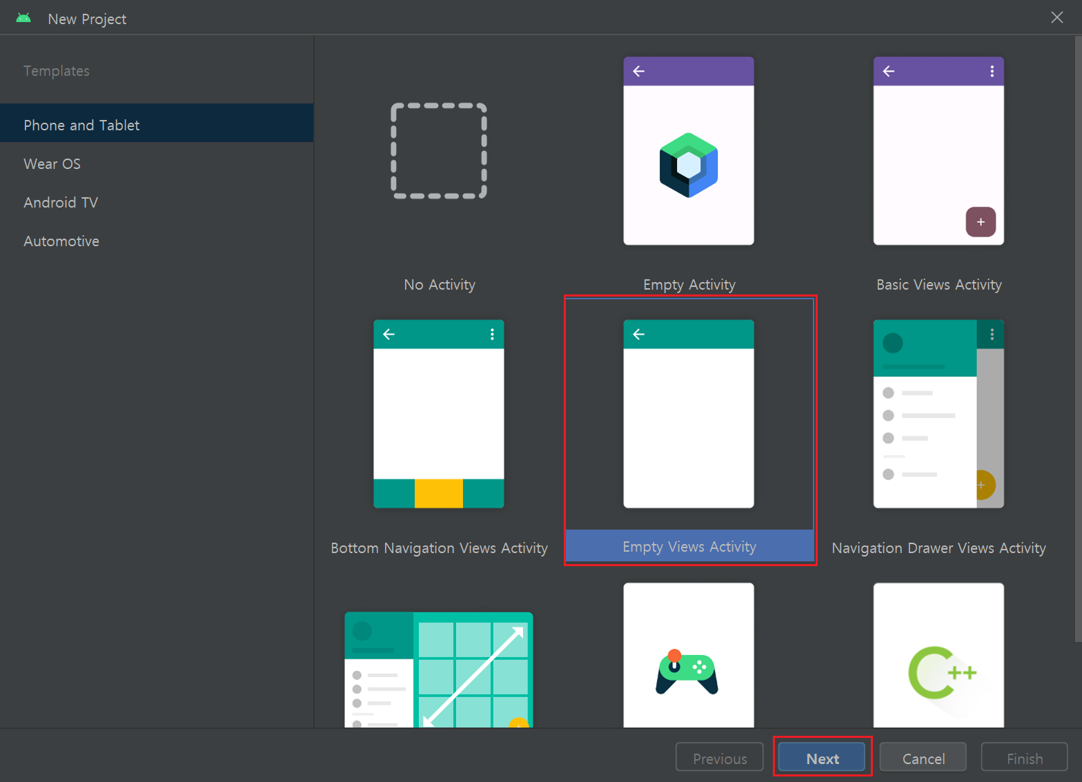 프로젝트 생성 시, 기존에는 Empty Activity를 선택했지만, Empty Views Activity를 선택해야 개발언어 선택이 가능하다. 자바 프로젝트 생성을 하고싶다면 Empty Views Activity를 선택하여 프로젝트를 생성해야 한다.